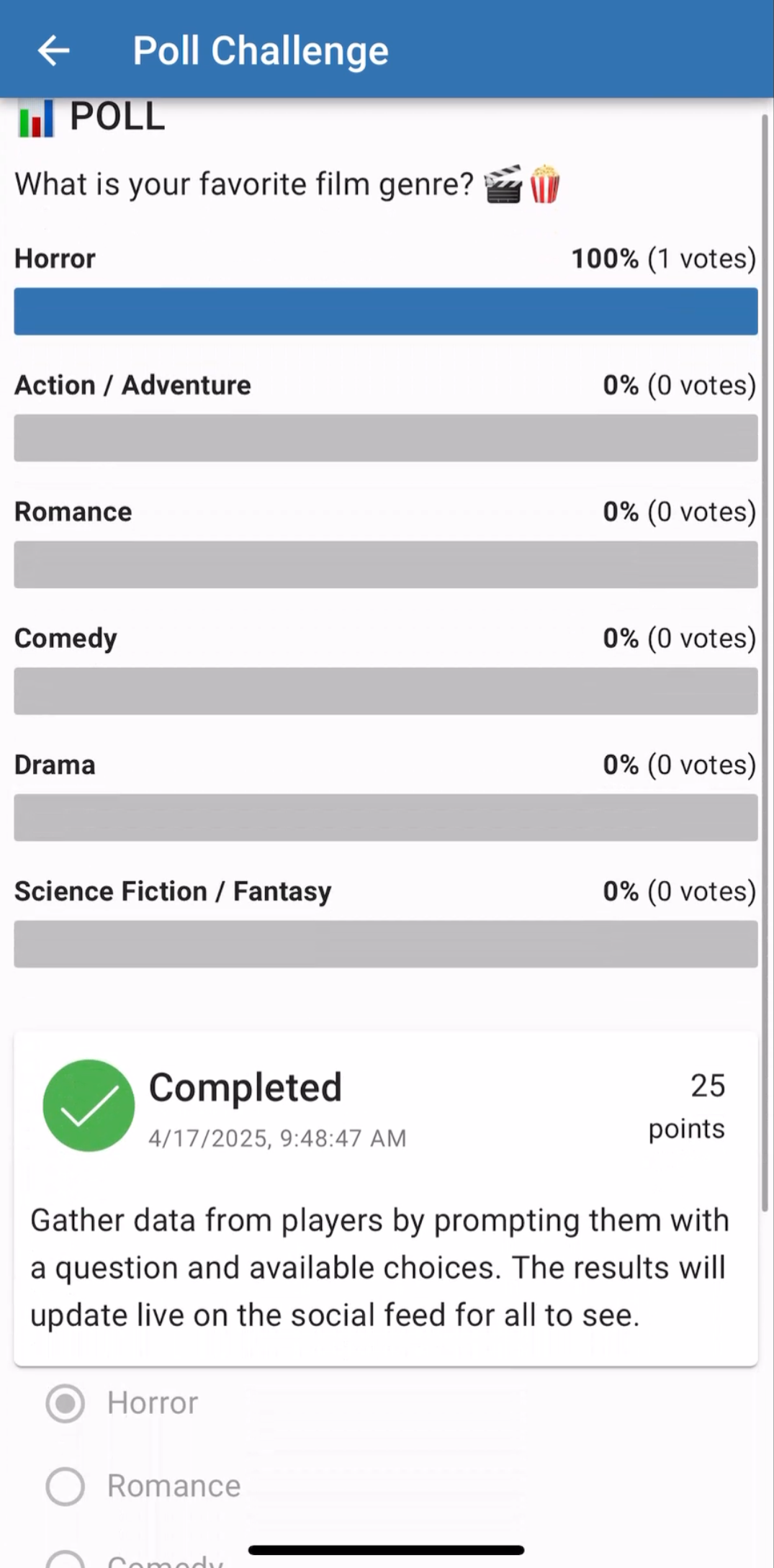 Time to let your voice be heard! The new Poll challenge lets participants weigh in on fun or meaningful questions, with results popping up in the Social Feed for everyone to see. Whether it’s voting on the best team costume or gathering feedback about the event, it’s a fantastic way to build community and spark conversation.