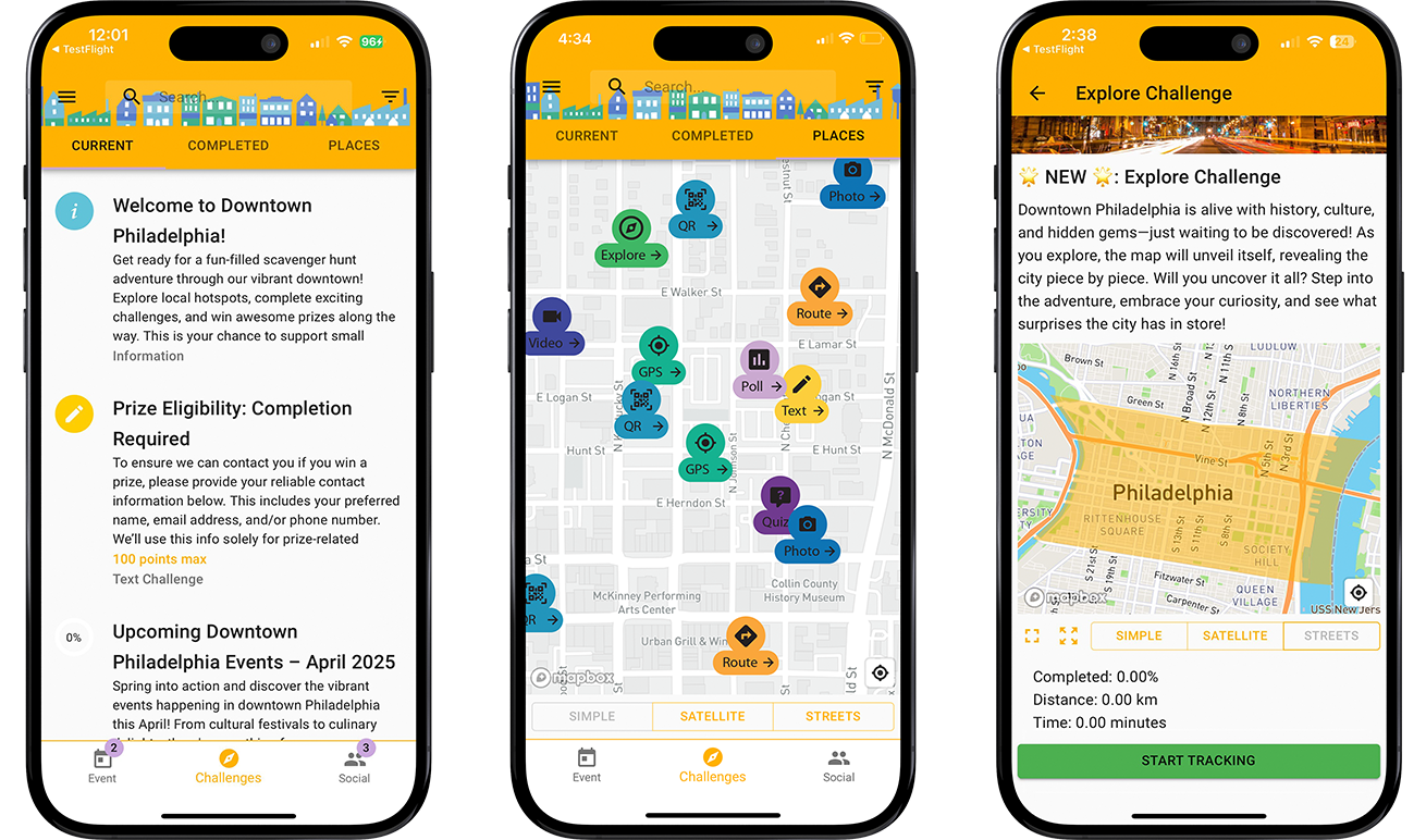 TownTrek invites downtowns across the nation to transform their streets into celebration grounds for America’s 250th birthday! Using our mobile app, communities can craft custom interactive events that celebrate local heritage, highlight small businesses, and spark exploration.